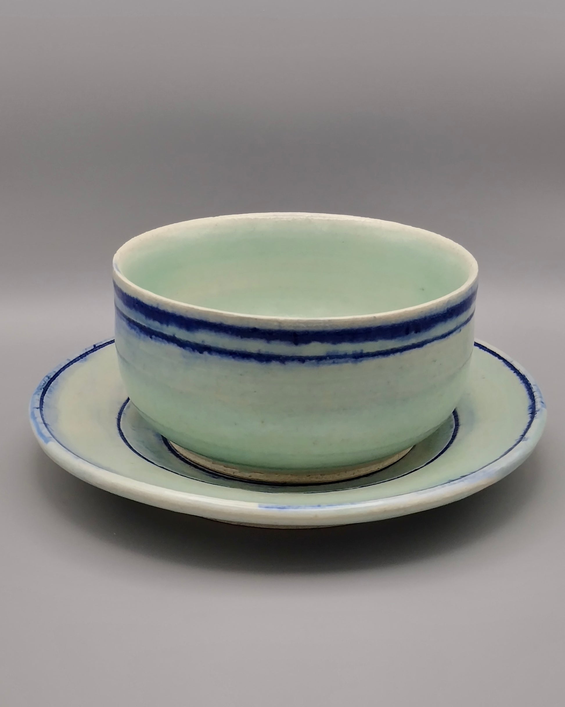 Add a splash of charm to your table with the Blurred Lines Bowl and Saucer set. Featuring a delightful chun-style blue-green glaze accented by dark blue line work. Perfect for your morning cereal or evening soup, it’s where function meets creative flair—because who said dinnerware can’t have a little fun?