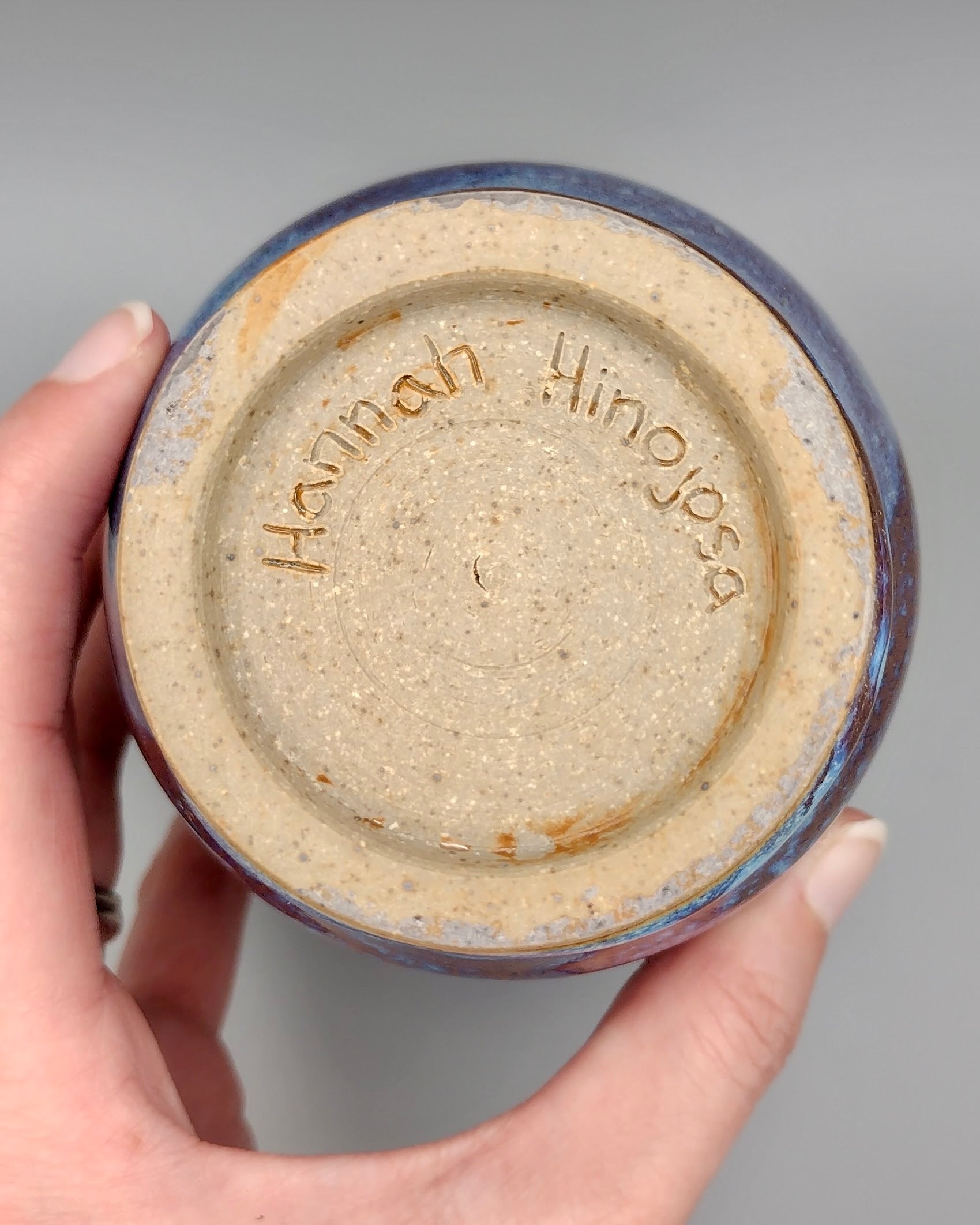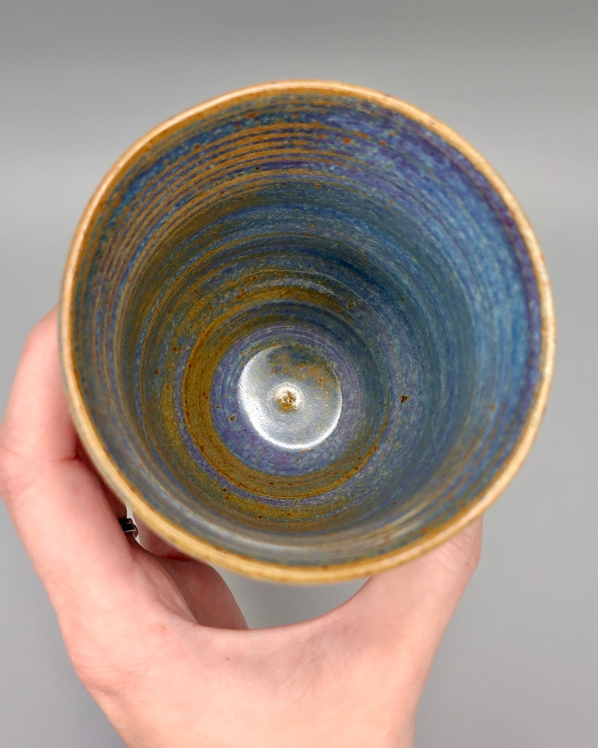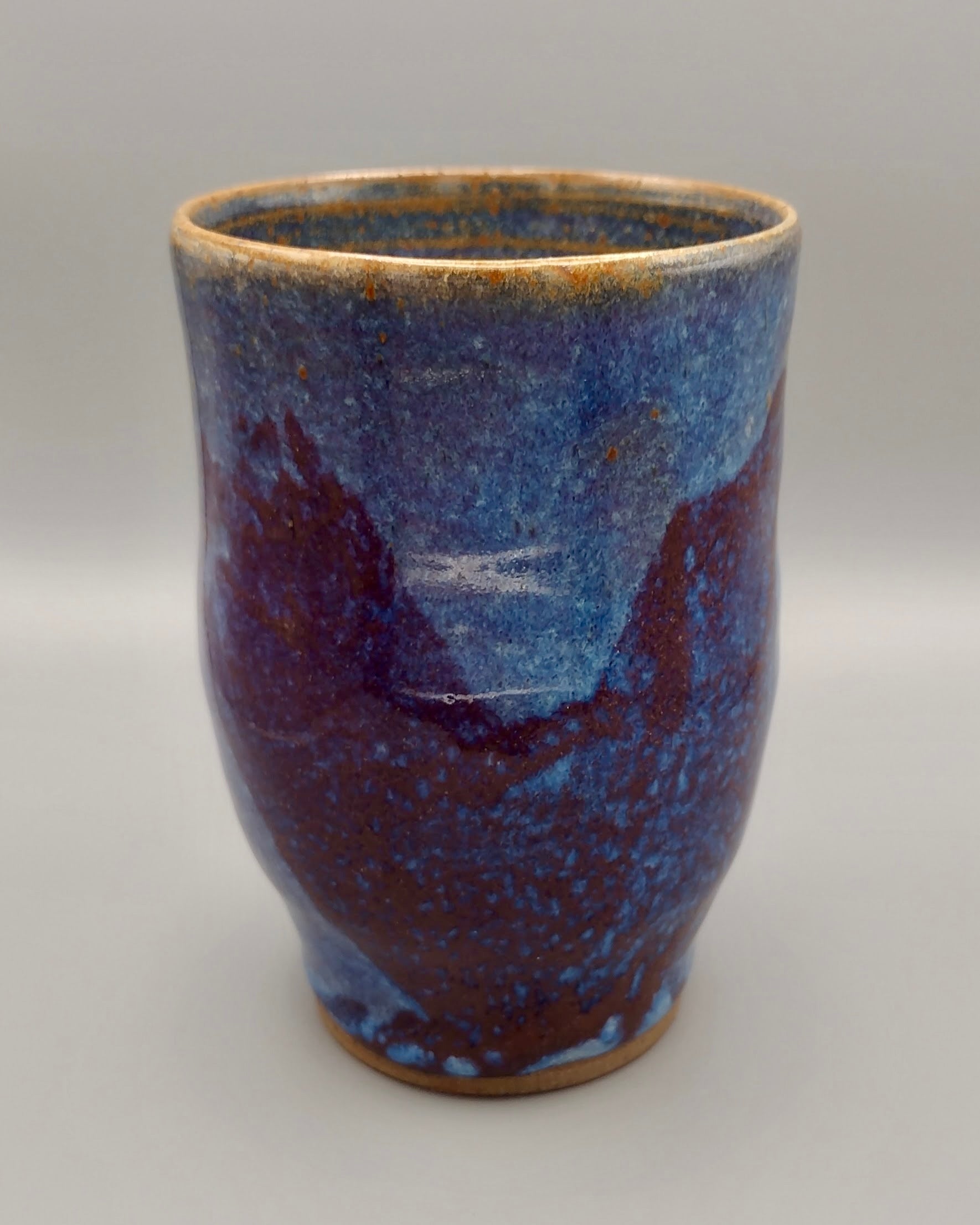 This handmade ceramic cup features a soft blue haze glaze layered with brushed-on crimson, creating gentle movement and depth across the surface. Thrown by hand and finished with intention, the interplay of color and brushwork makes each angle feel considered while remaining perfectly suited for everyday use.