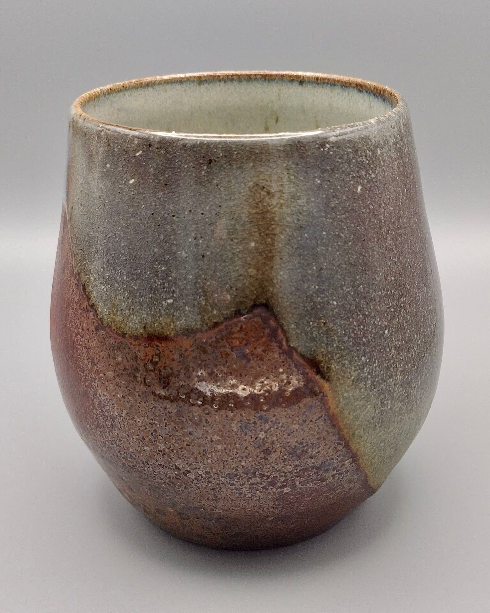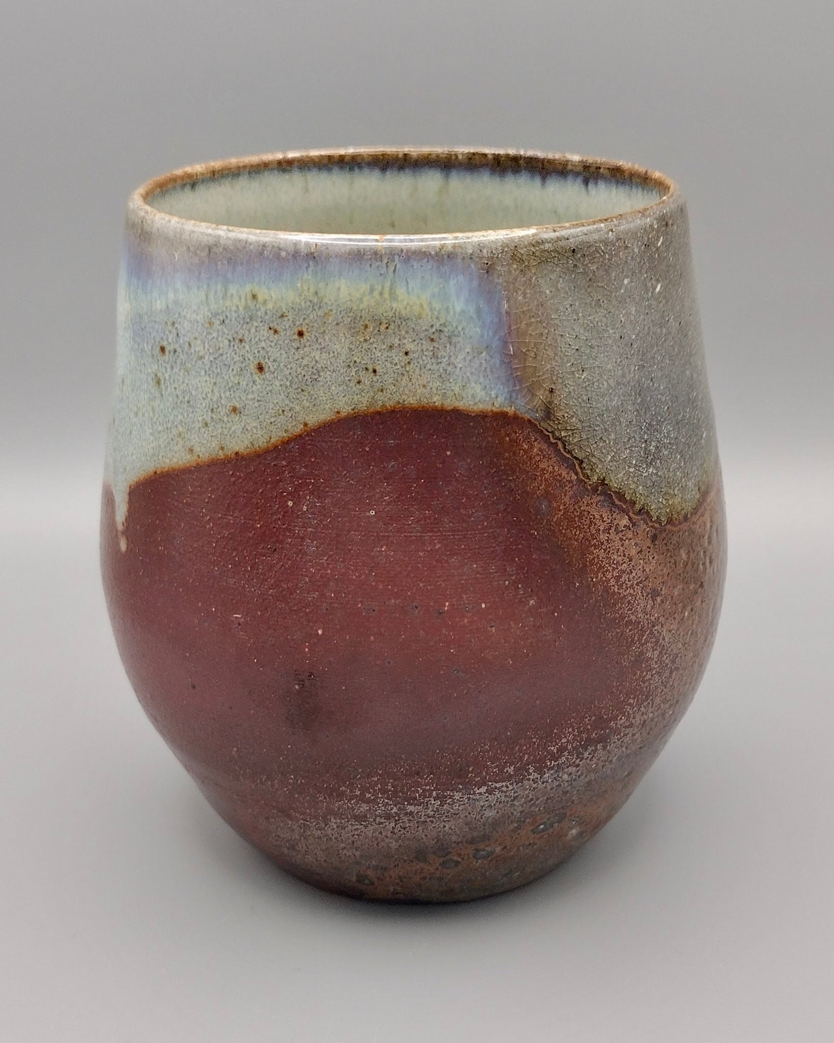 Each sip from this handcrafted ceramic cup celebrates the magic of soda firing. The clay's deep burgundy base transforms into shimmering metallic tones across the surface, while delicate opalescent breaks dance around the rim—a natural result of the firing process that makes every cup truly one-of-a-kind. A functional work of art that brings warmth and character to your daily ritual.