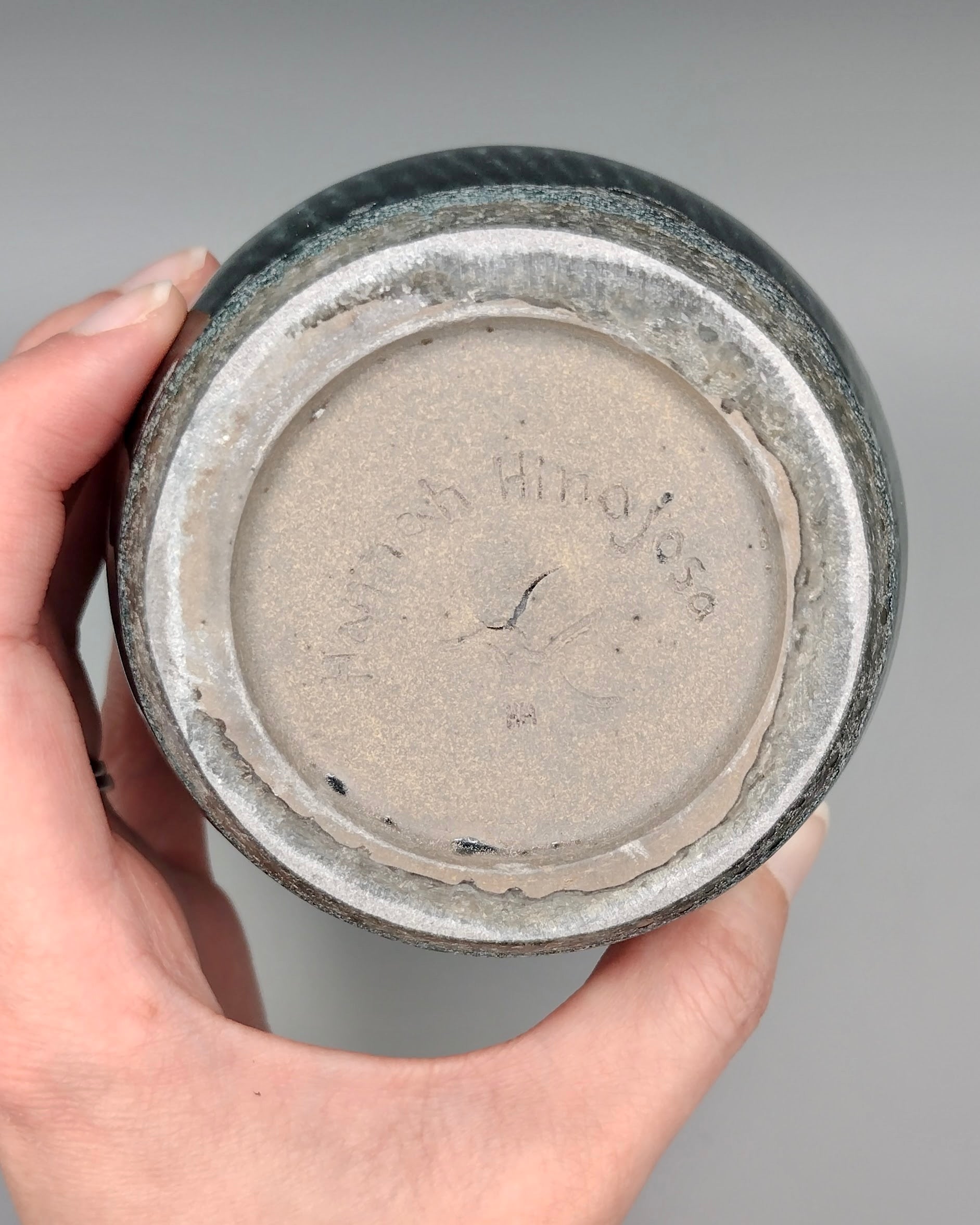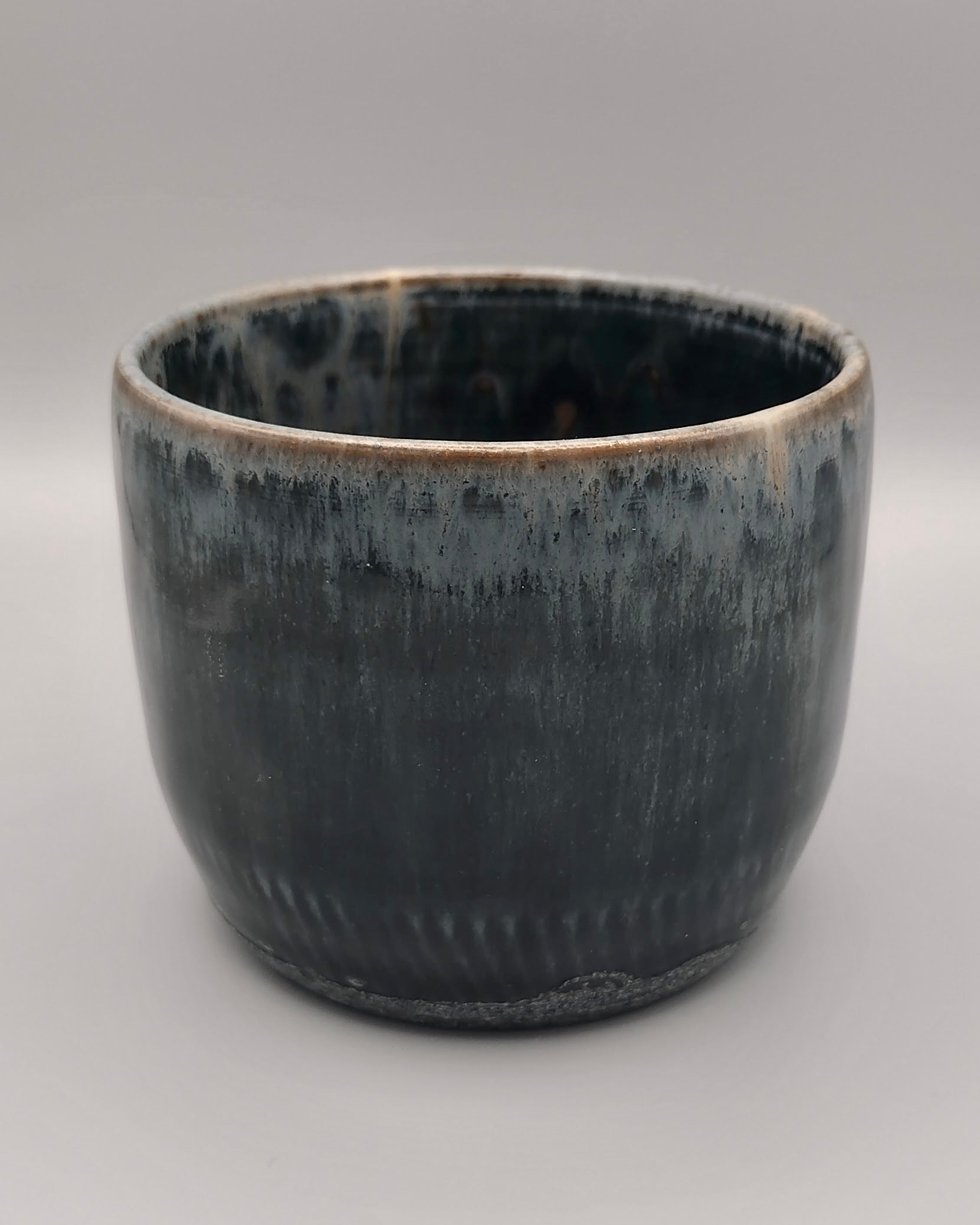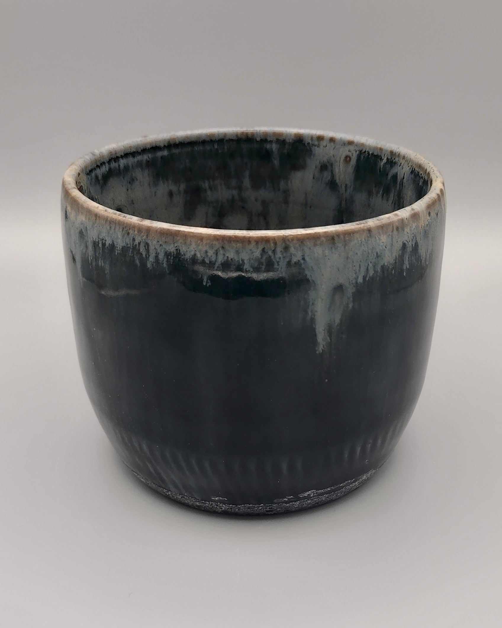 Handcrafted ceramic cup featuring a striking dark blue to black glaze with natural gray breaks along the rim and textured detailing near the base. This "seconds" piece shows minor surface blemishes where the tan clay body peeks through the interior glaze—a cosmetic quirk that doesn't affect functionality. Perfect for those who appreciate authentic, artisan pottery with character and charm at a discounted price.
