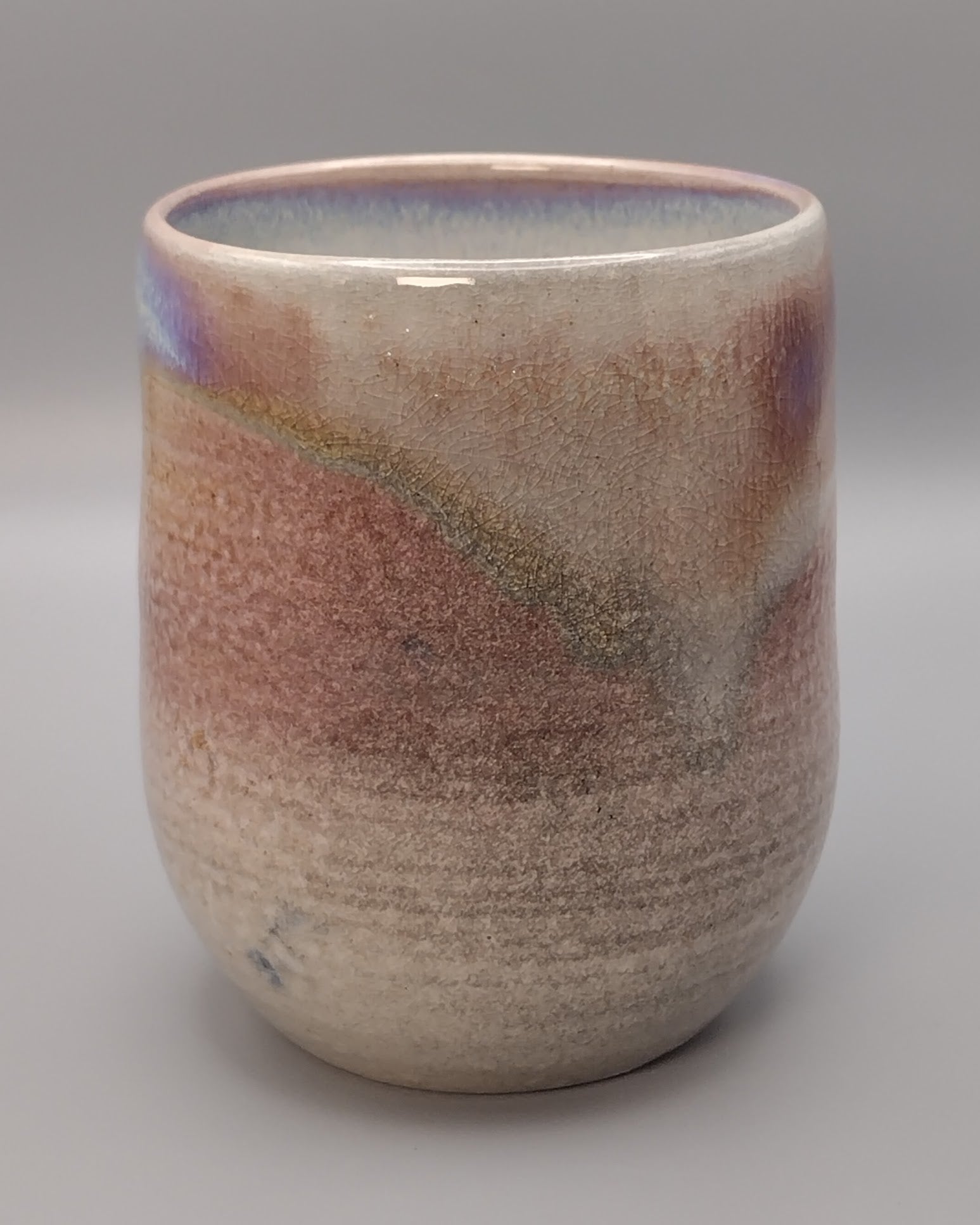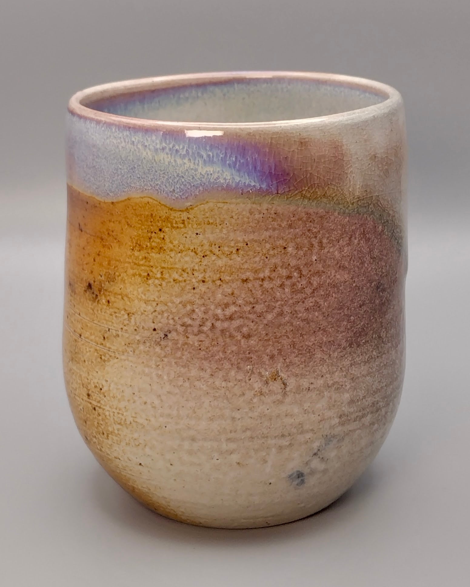 This handcrafted ceramic cup featuring the unique character of soda firing, which creates a stunning spectrum of natural colors. The clay showcases warm toasted reds and coppers that blend into ethereal opalescent purples and blues. Perfect for daily use or as a meaningful gift for someone who appreciates artisan craftsmanship and natural beauty in their everyday moments.